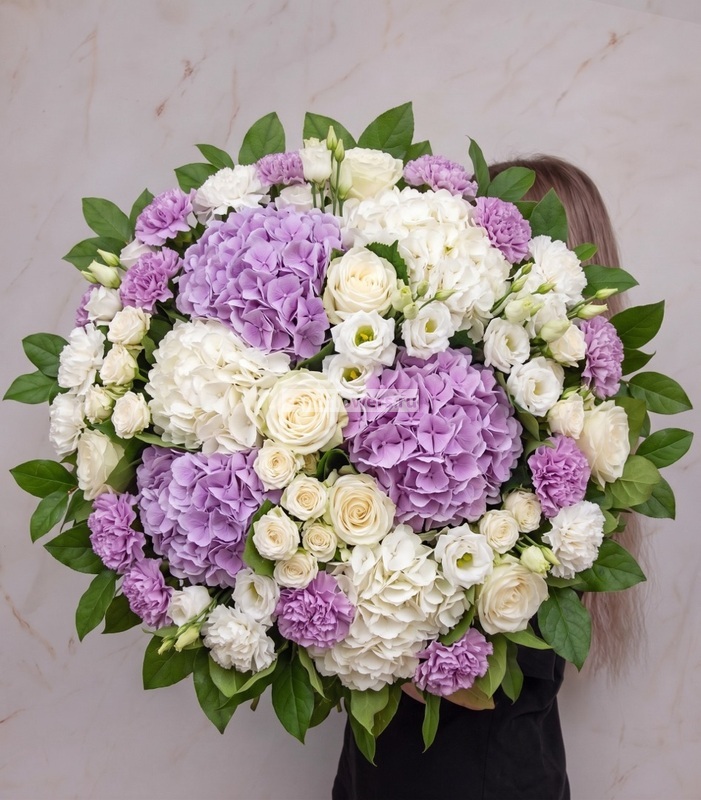 Состав: Салал (20), Лента натуральная (7), Гвоздика лиловая (15), Роза кустовая белая (10), Эустома белая (10), Роза белая (20), Гвоздика белая (15), Гортензия белая CO (3), Гортензия лиловая СО (3)
